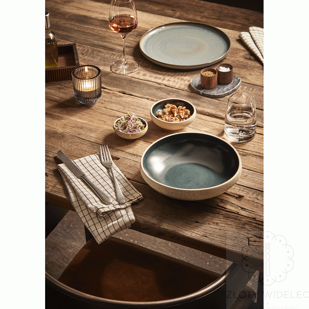 Dzięki minimalistycznemu designowi doskonale komponuje się zarówno z białą porcelaną, jak i kolorowymi elementami zastawy, umożliwiając tworzenie efektownych aranżacji stołowych.