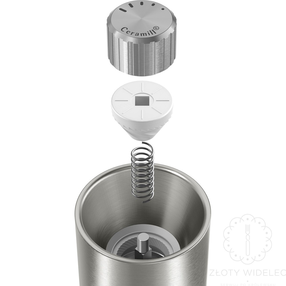 Wyposażony w zaawansowany ceramiczny mechanizm mielący CeraMill® – twardszy od stali i całkowicie neutralny dla smaku – pozwala wydobyć z przypraw ich pełen aromat bez niepożądanych posmaków. Dzięki płynnej regulacji mielenia możesz z łatwością dopasować grubość do rodzaju przypraw i preferencji kulinarnych – od drobno zmielonego pieprzu po gruboziarnistą sól.