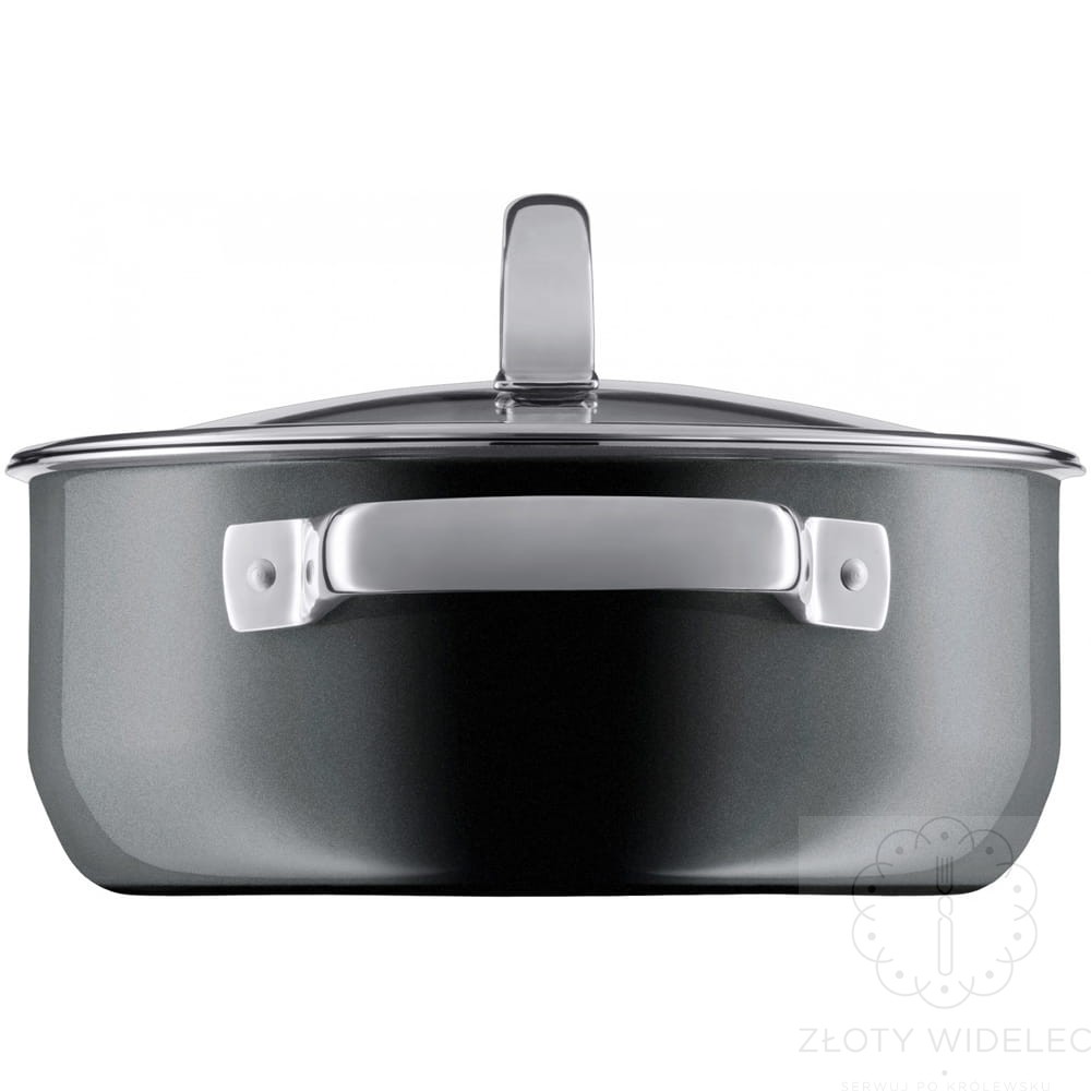 Garnek wyposażono w szklaną pokrywkę odporną na wysoką temperaturę, która umożliwia kontrolowanie procesu gotowania. Szeroki rant ułatwia przelewanie i odcedzanie, a uchwyty o pustej konstrukcji nagrzewają się wolniej, zwiększając komfort i bezpieczeństwo użytkowania.