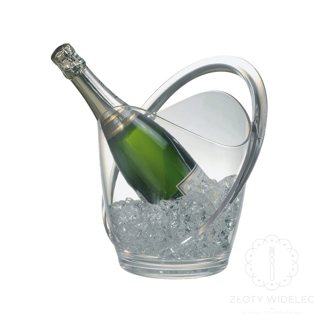 Stylowy pojemnik z ozdobnym uchwytem. Cooler wykonany jest z przezroczystego tworzywa Akrylu. Idealny do schłodzenia jednej butelki wina lub szampana. Made in UE. Gwarancja 2 lata.