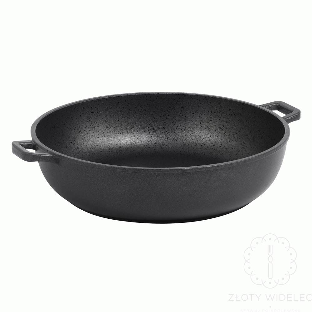Korpus wykonany z grubego odlewanego aluminium zapewnia równomierne rozprowadzanie ciepła oraz stabilność temperatury podczas gotowania. Wysokiej jakości powłoka nieprzywierająca umożliwia smażenie z minimalną ilością tłuszczu, zapobiega przywieraniu potraw i ułatwia czyszczenie naczynia. Dzięki solidnej konstrukcji patelnia jest odporna na odkształcenia oraz przystosowana do intensywnego użytkowania.