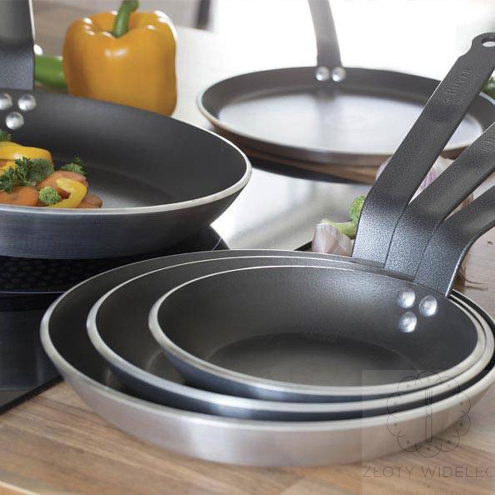 Patelnia posiada charakterystyczny profil Lyonnaise z lekko rozkloszowanymi i zaokrąglonymi ściankami, które ułatwiają mieszanie składników oraz zsuwanie gotowych potraw bezpośrednio na talerz. Solidny nitowany uchwyt zapewnia stabilny chwyt i komfort użytkowania nawet podczas intensywnego smażenia.