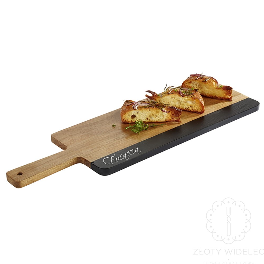 Deska drewniana do serwowania dań z uchwytem akacja 42x 18 cm z tablicą na kredę