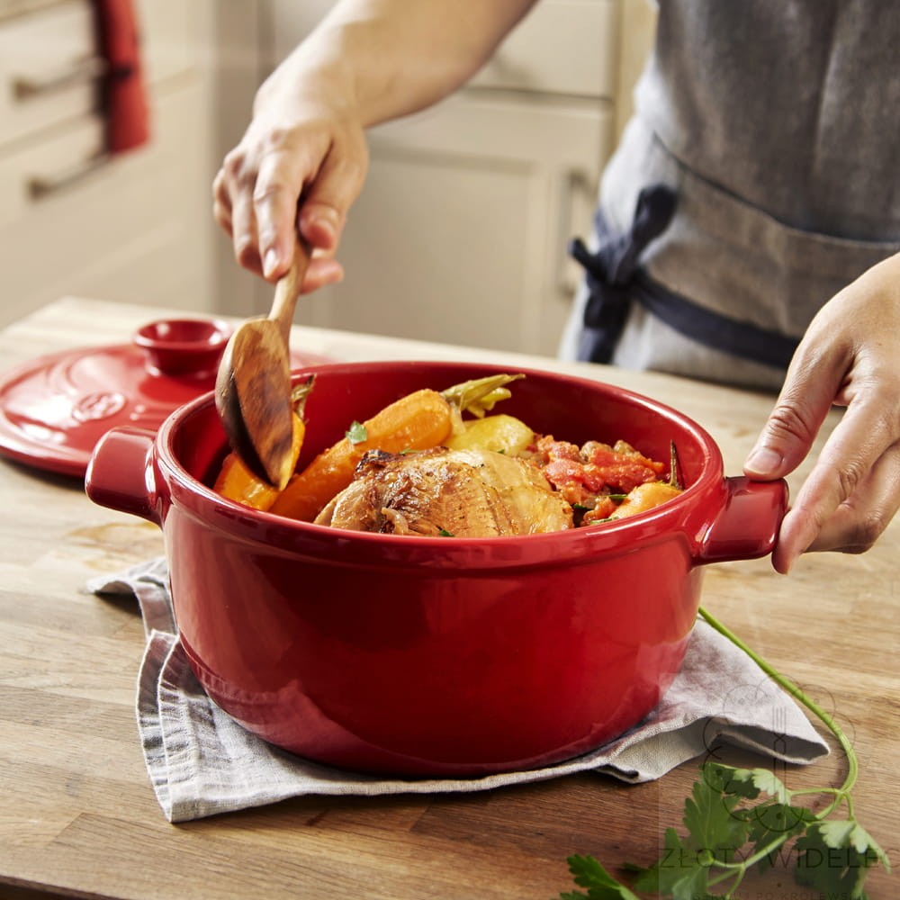 Garnek wyposażony jest w dopasowaną pokrywę z charakterystycznymi wypustkami od wewnętrznej strony, które umożliwiają cyrkulację pary wodnej podczas gotowania. Skraplająca się para wraca do potrawy, dzięki czemu dania pozostają soczyste i pełne aromatu. Ceramika jest odporna na bardzo wysokie temperatury oraz szok termiczny – naczynie można przenosić z lodówki lub zamrażarki bezpośrednio do gorącego piekarnika.