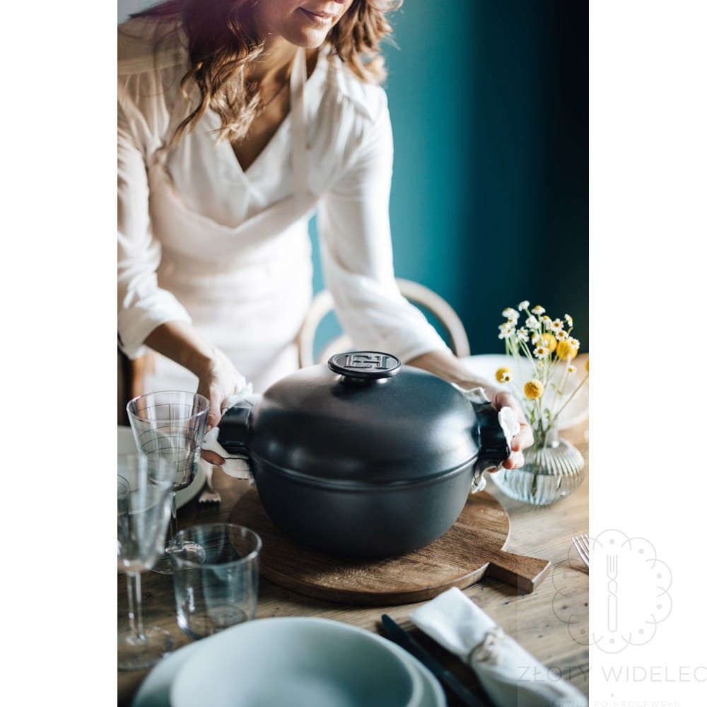 Czarny kolor i eleganckie linie sprawiają, że naczynie świetnie prezentuje się zarówno w nowoczesnej, jak i klasycznej kuchni. Ergonomiczne uchwyty ułatwiają przenoszenie bez ryzyka poparzenia. Po użyciu naczynie możesz bezpiecznie umyć w zmywarce — to komfort, który docenisz na co dzień.
