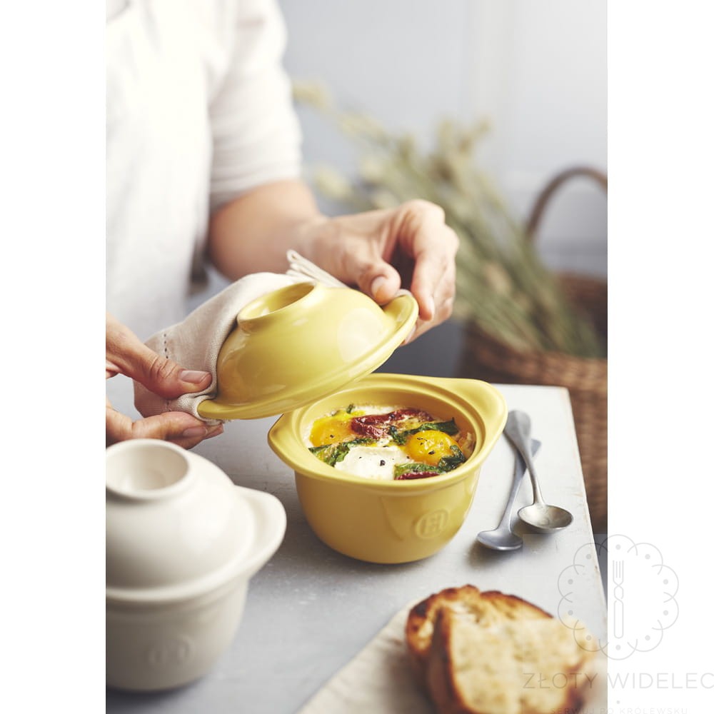 Wykonane z wysokiej jakości ceramiki HR® (High Resistance), naczynie równomiernie rozprowadza i długo utrzymuje ciepło, co gwarantuje idealne efekty zapiekania — jajka stają się delikatne, kremowe w środku i lekko przyrumienione na zewnątrz. Odporność na wysokie temperatury sprawia, że naczynie można bezpiecznie używać w piekarniku, a po użyciu umyć je w zmywarce, co znacząco ułatwia codzienne użytkowanie.