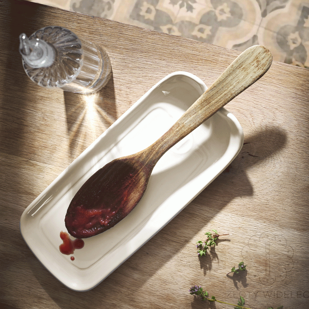Podstawek wykonany jest z wysokiej jakości ceramiki HR® (High Resistance), charakterystycznej dla produktów marki Emile Henry. Materiał ten jest bardzo trwały, odporny na zarysowania i wysokie temperatury, a jednocześnie łatwy w utrzymaniu czystości. Centralne wyprofilowanie podtrzymuje łyżkę w lekko uniesionej pozycji, co zwiększa higienę i pozwala zatrzymać nadmiar sosu czy płynu na powierzchni podstawki.