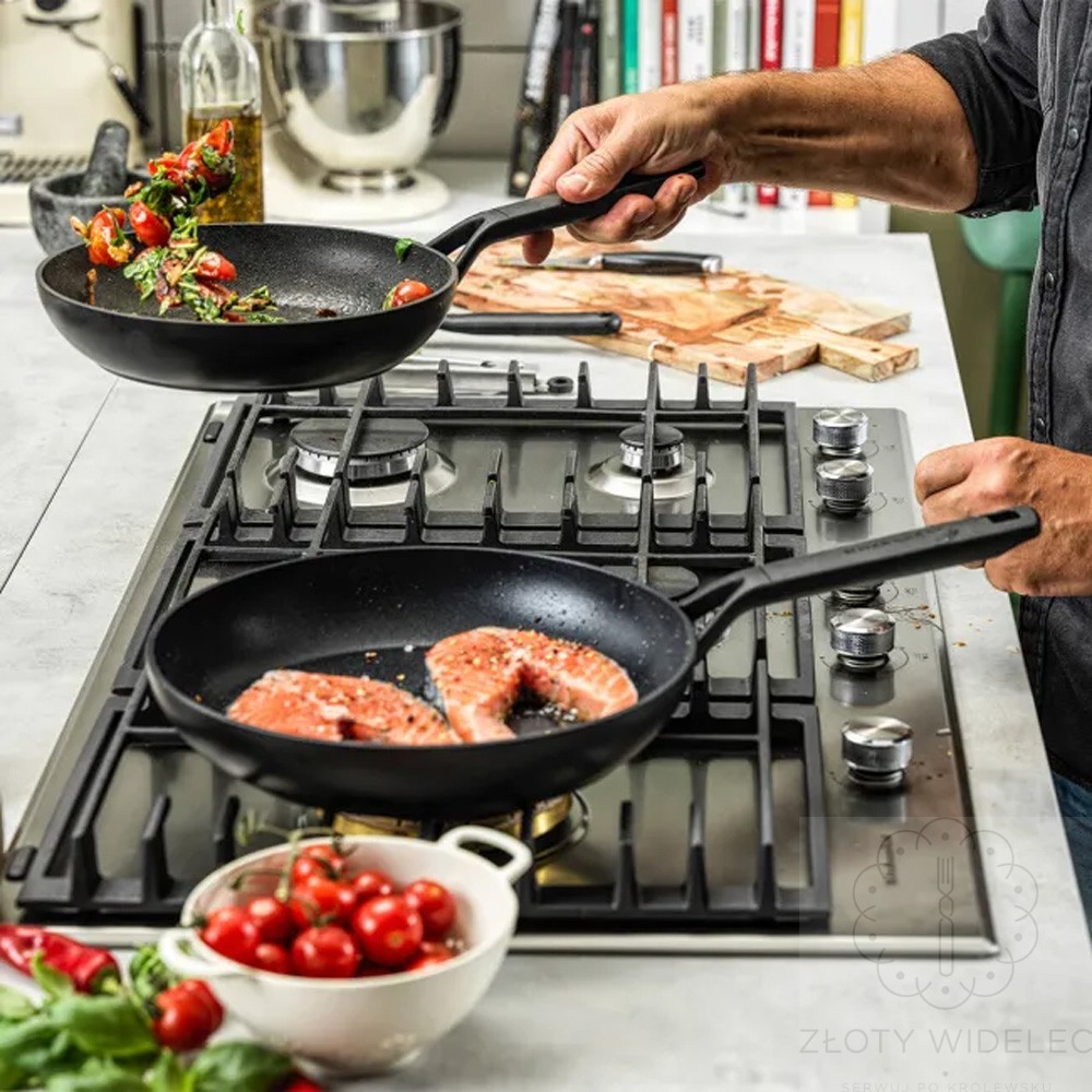 Patelnia została wykonana z wysokiej jakości kutego aluminium, które zapewnia szybkie nagrzewanie oraz równomierne rozprowadzanie ciepła. Dzięki temu potrawy smażą się równomiernie, zachowując odpowiednią strukturę i smak.