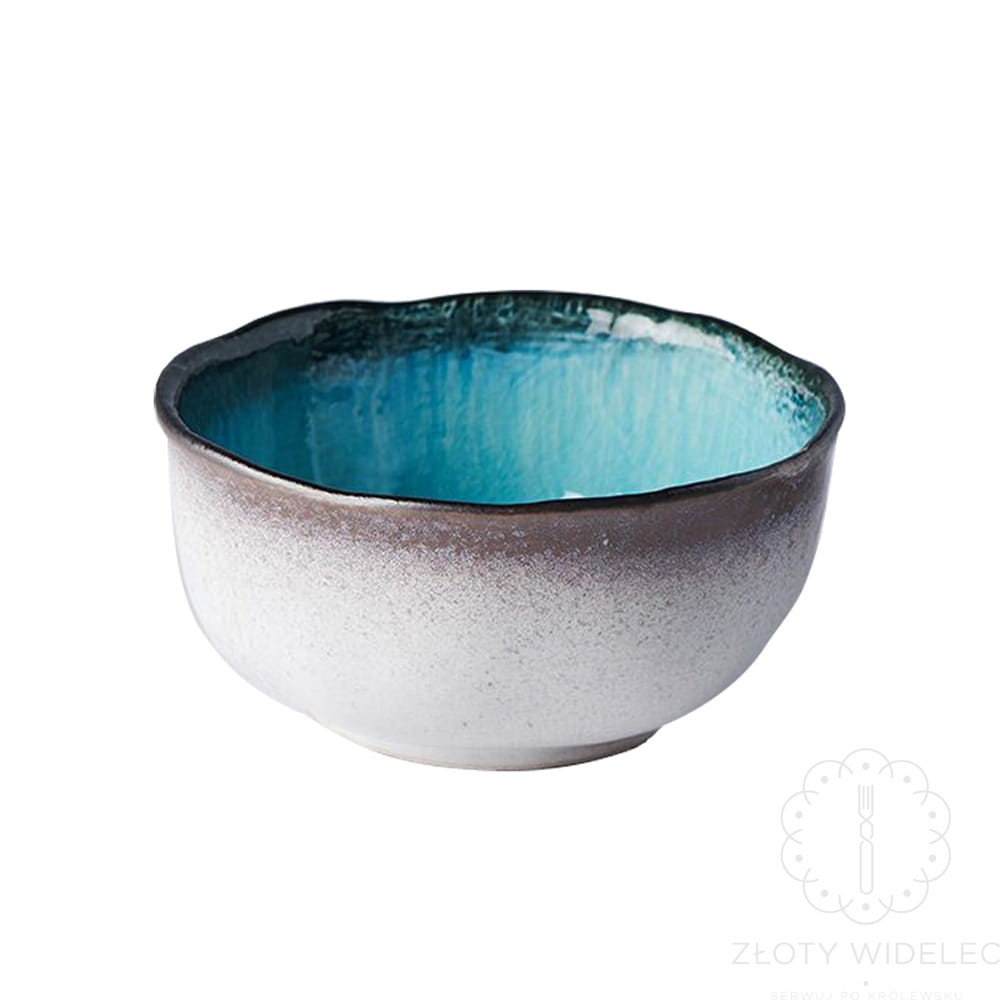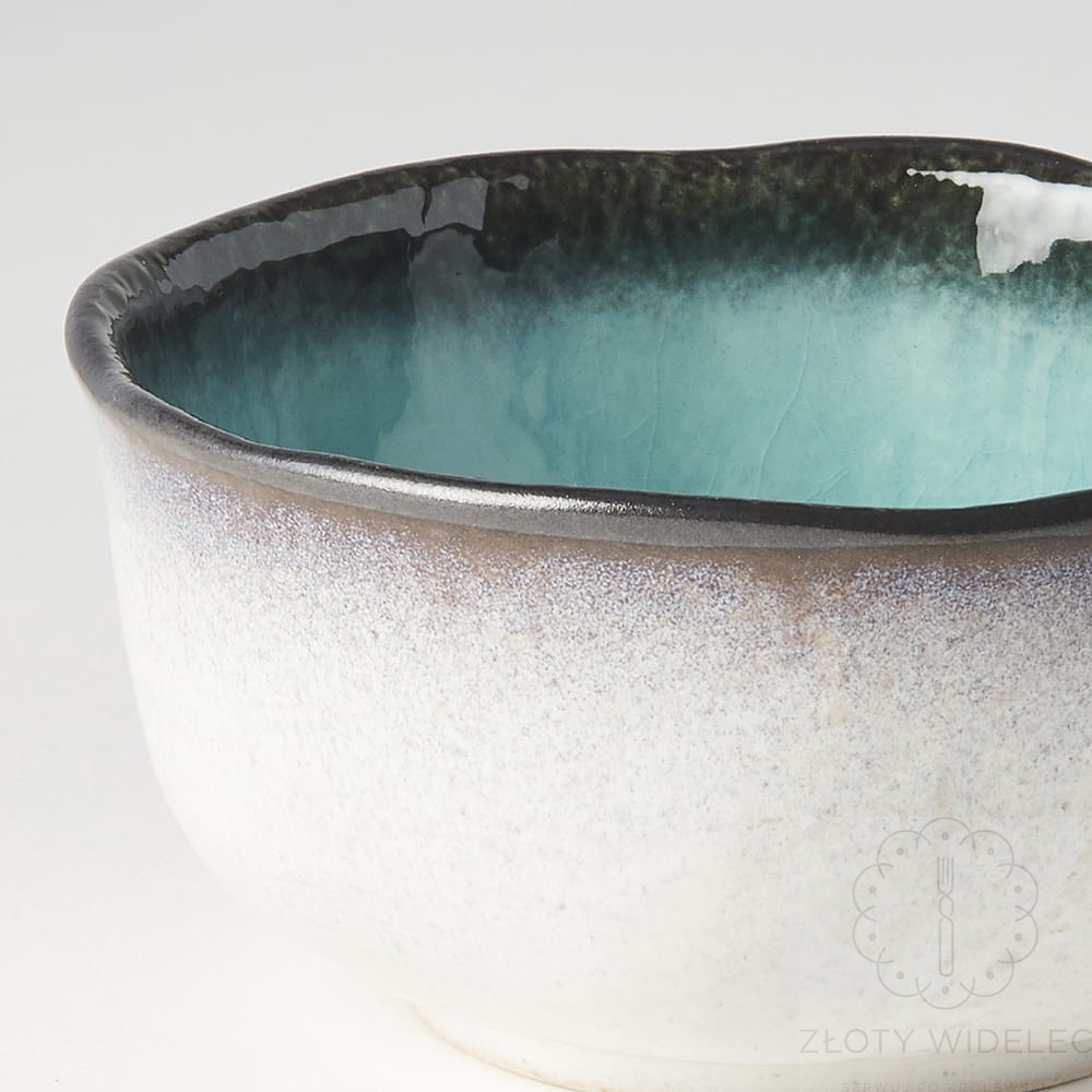 Miska wyróżnia się unikalnym designem – wnętrze w turkusowym odcieniu przechodzi w ciemne, matowe brzegi z subtelnymi, artystycznymi przejściami kolorów. Nieregularny kształt nadaje jej wyjątkowego, ręcznie wykonanego charakteru, który podkreśla tradycyjne japońskie rzemiosło.