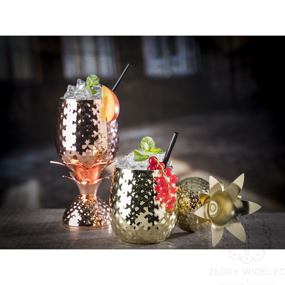 Szklanka w kształcie anansa do drinków i innych zimnych napojów. Kubek wykonany ze stali nierdzewnej INOX z miedzianą powłoką. Dzięki czemu wygląda bardzo ekstrawagancko. Kubek zachwyca swoim niepowtarzalnym wyglądem. Zalecamy mycie ręczne. Gwarancja 2 lata.