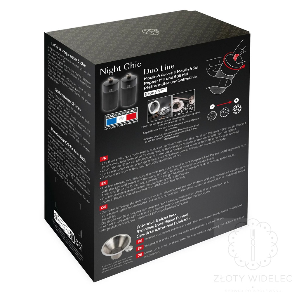 Peugeot Night Chic to zestaw, który łączy nowoczesne wzornictwo inspirowane stylem skandynawskim z niezawodną francuską jakością. Składa się z dwóch ręcznych młynków o wysokości 12 cm – do pieprzu i soli – oraz praktycznego lejka ze stali nierdzewnej, który ułatwia napełnianie przyprawami bez rozsypywania.