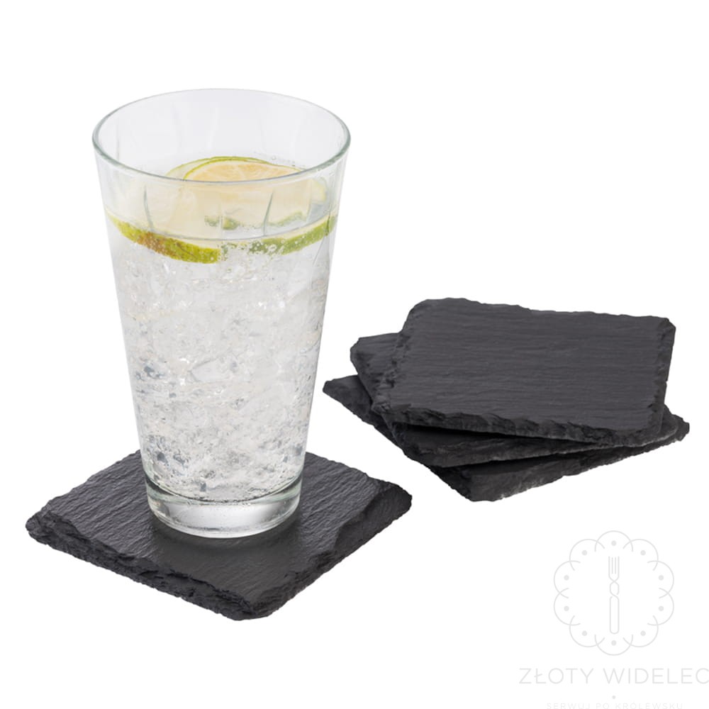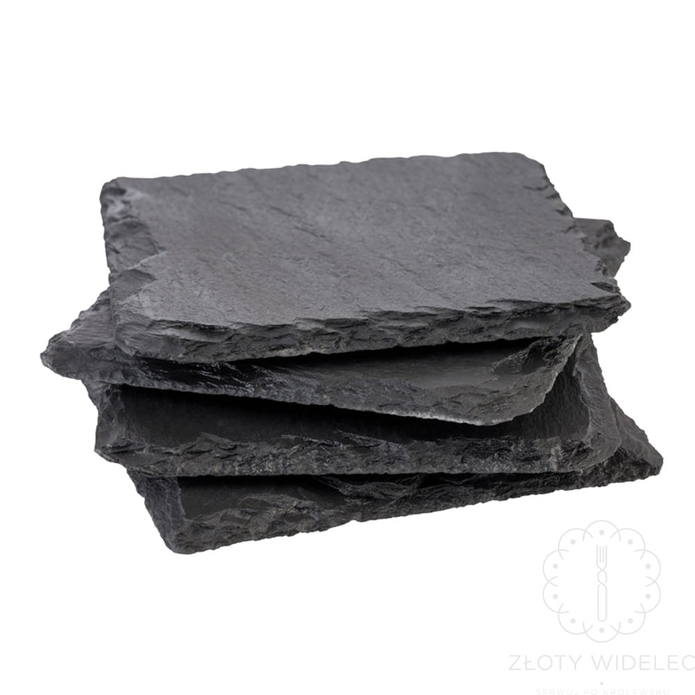 Tace kwadratowe 4 szt. wykonane z naturalnego kamienia łupkowego. Krawędzie tacy są łamane dzięki czemu dokładnie widać naturalną strukturę kamienia. Od spodu taca chroniące przed zarysowaniem antypoślizgowe nóżki. Taca ma świetne właściwości termoizolacyjne, kiedy się ją schłodzi przez bardzo długo pozostaje zimna. Powierzchnia jest wodoodporna, zaimpregnowana w odpowiedni sposób aby można było bezpośrednio na niej serwować dania. Idealna do wszelkiego rodzaju przystawek, sushi, deserów, może posłużyć jako talerz na ser, wędliny, warzywa, owoce. Zastosowań może być mnóstwo. Świetna alternatywa dla talerzy aby podać danie w oryginalny nietuzinkowy sposób. Gwarancja 2 lata.