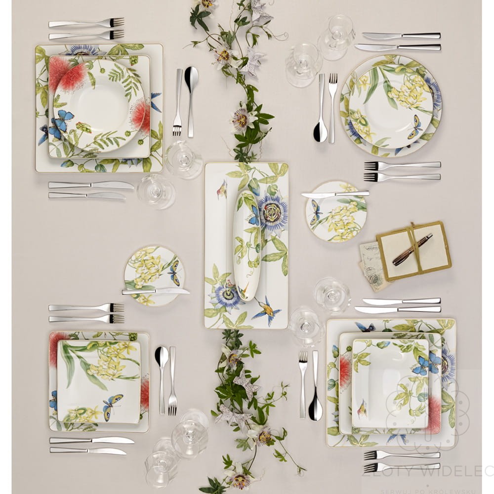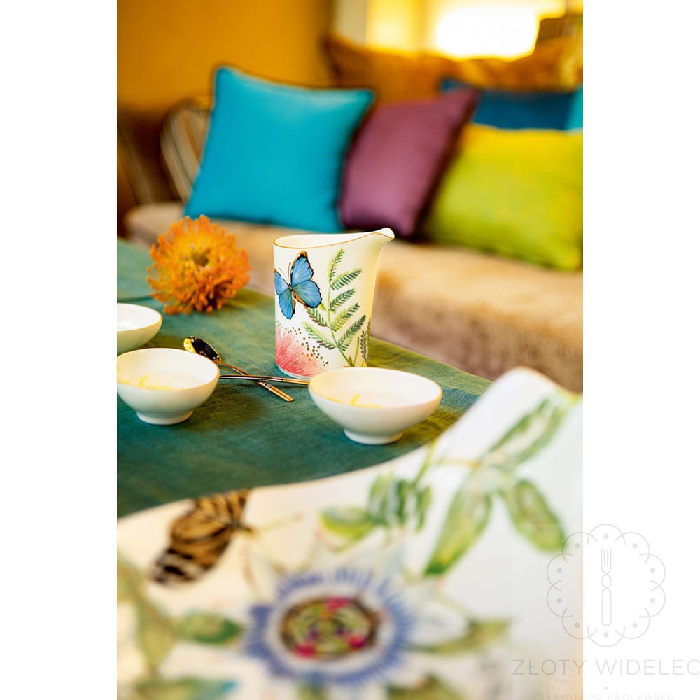FMlecznik z kolekcji porcelany Amazonia niemieckiego producenta: Villeroy & Boch. Ponadczasowy, spektakularny, elegancki kształt w żywych kolorach sprawia, że kolekcja naprawdę przyciąga wzrok. Tropikalny wzór, oraz szlachetna porcelana kostna premium tworzy urzekający efekt. Kształty porcelany nawiązują do minimalistycznego stylu lat 50-tych, egzotyczny wystrój pełen zieleni lasów deszczowych, latających motyli i kolibrów inspirowany był podróżami światowej sławy przyrodnika Alexandra von Humboldta po Ameryce Południowej. Proste formy porcelany doskonale wpisały się w barwny wystrój, który dodatkowo uzupełniają złote linie . Cała kolekcja Amazonia to idealny prezent ze względu na egzotyczny, pełen kolorów motyw , niezależnie od tego, czy obdarowana osoba otrzyma jakikolwiek egzemplarz z tej serii.