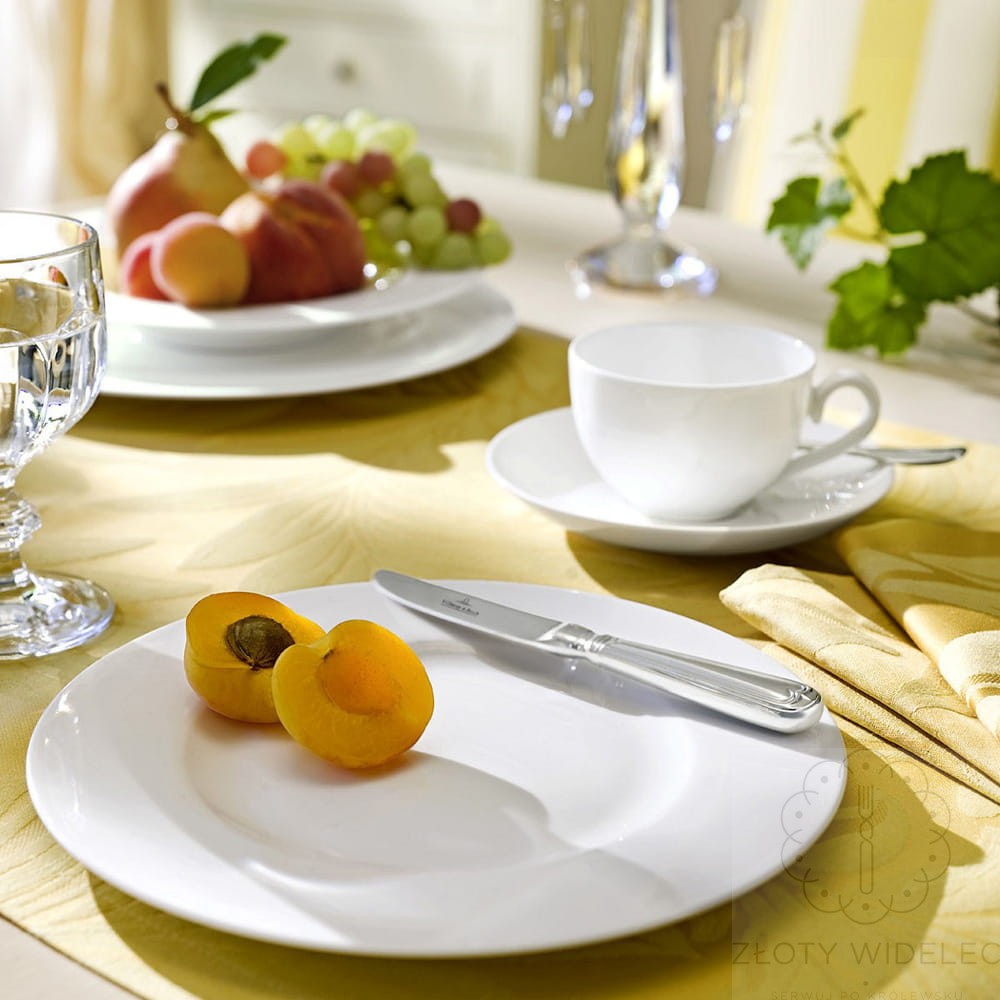 Talerz z kolekcji porcelany Royal niemieckiego producenta: Villeroy & Boch. Zestaw serwisowy składa się z najpopularniejszych produktów z tej linii. Klasyczna, elegancka zastawa stołowa idealna do codziennego użytkowania wykonana z najwyższej jakości porcelany. Ma piękny mleczny odcień, dzięki czemu będzie pasowała do każdego wystroju wnętrza.