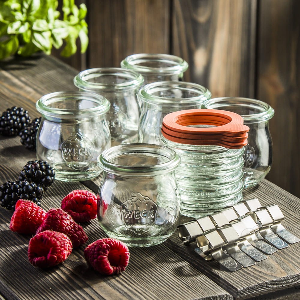 Zestaw sześciu słoików z pokrywką, uszczelką oraz dwiema zapinkami o pojemności 1550 ml. od marki WECK.