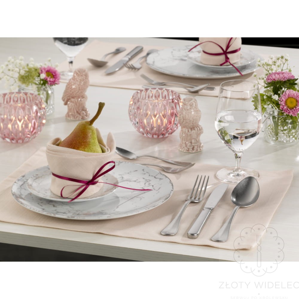 Każdy element zestawu został wykonany z opatentowanej stali nierdzewnej Cromargan® 18/10 i pokryty warstwą srebra o grubości 30 g na dm². To rozwiązanie stosowane w wysokiej klasy gastronomii i hotelach premium, które nie tylko nadaje sztućcom szlachetnego, lustrzanego blasku, ale również zapewnia lepszą ochronę przed ścieraniem podczas codziennego użytkowania.
