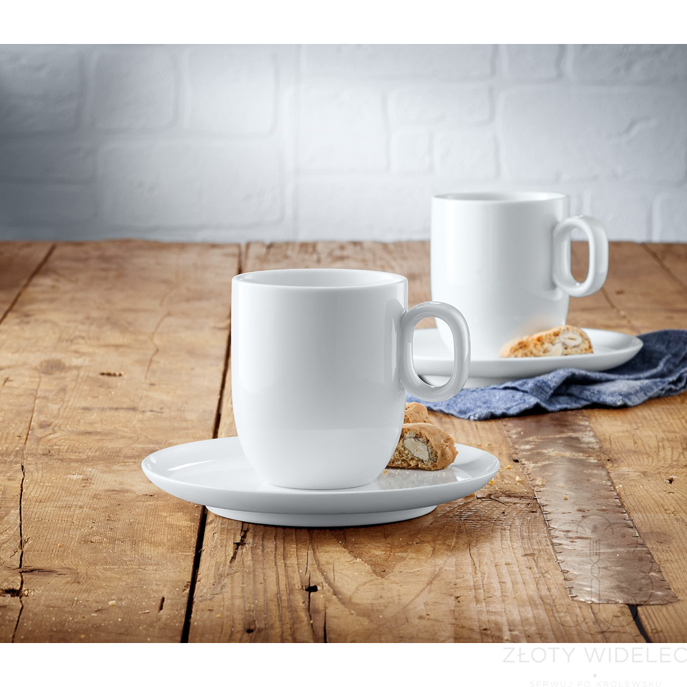 Komplet zawiera dwie filiżanki o pojemności 170 ml i dwa dedykowane spodki z podwyższonym rantem, który chroni przed przypadkowymi rozlaniami. Każdy element został wykonany z wysokiej jakości porcelany w Niemczech, z dbałością o detale użytkowe i estetyczne. Antypoślizgowe wypustki zapewniają stabilność filiżanek na spodkach, a funkcja układania jedna na drugiej (zarówno filiżanek, jak i spodków) pozwala zaoszczędzić miejsce w kuchennych szafkach. Zestaw można bezpiecznie myć w zmywarce.