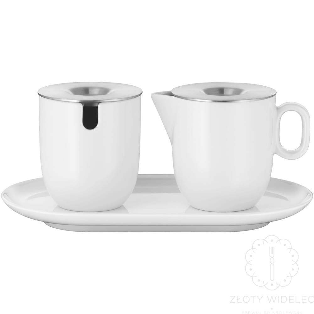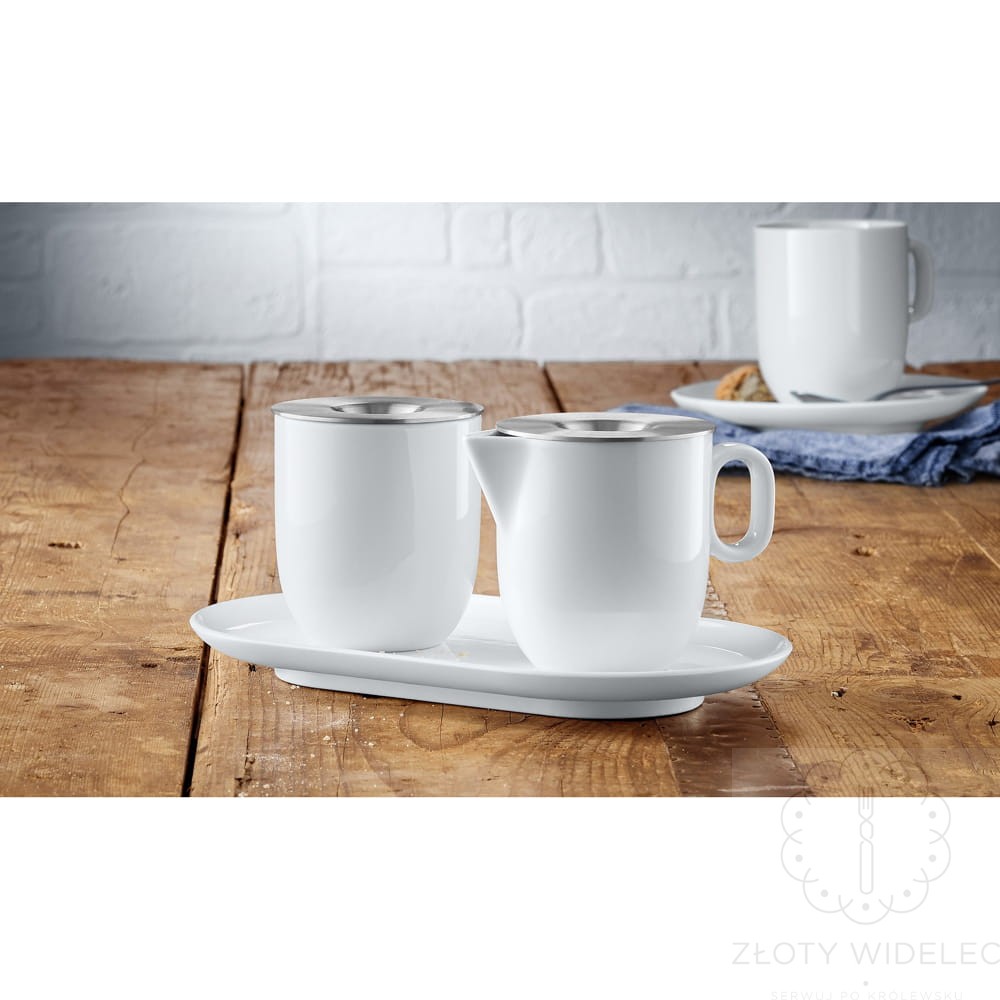 Elementy porcelanowe – mlecznik i cukiernica – zostały wykonane z wysokiej jakości porcelany, a ich pokrywki z odpornej stali nierdzewnej Cromargan® 18/10, zapewniającej trwałość, estetykę i ochronę zawartości. Praktyczna taca z podwyższonym rantem zabezpiecza przed rozlaniem, a antypoślizgowe wypustki gwarantują stabilność całego zestawu. Mlecznik wyposażono w ergonomiczny uchwyt, który ułatwia serwowanie, a całość można bezpiecznie myć w zmywarce.