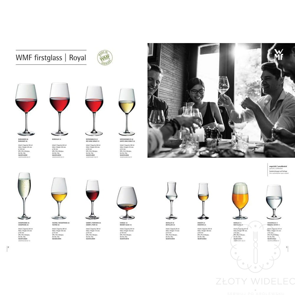 Kieliszki WMF charakteryzują się doskonałym, idealnym kształtem kielicha. Przejrzystość, najwyższa jakość, perfekcja wykonania zwiększają przyjemność z picia każdego trunku. Każdy kieliszek jest zaprojektowany pod konkretny rodzaju trunku, aby wydobyć z niego głębie smaku i aromatu. W kolekcji WMF znajdzie się kieliszek do każdego rodzaju alkoholu od win, poprzez likiery, nalewki aż po wódki, whisky, koniaki czy grappę.