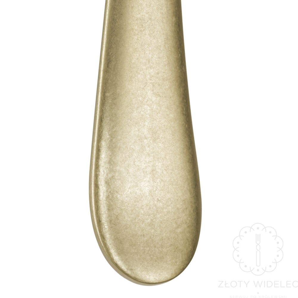 Wyjątkowy efekt uzyskano dzięki warstwowej powłoce PVD w kolorze pale gold, nanoszonej w procesie próżniowym. To właśnie ona nadaje sztućcom eleganckie, złote wykończenie, które jest nie tylko niezwykle cienkie i subtelne, lecz także trwałe, odporne na zarysowania i bezpieczne w kontakcie z żywnością. Dodatkowo, faktura stonewashed sprawia, że każdy element zestawu jest unikalny i niepowtarzalny, z delikatnym efektem postarzenia, który doskonale komponuje się np. z rustykalną porcelaną.