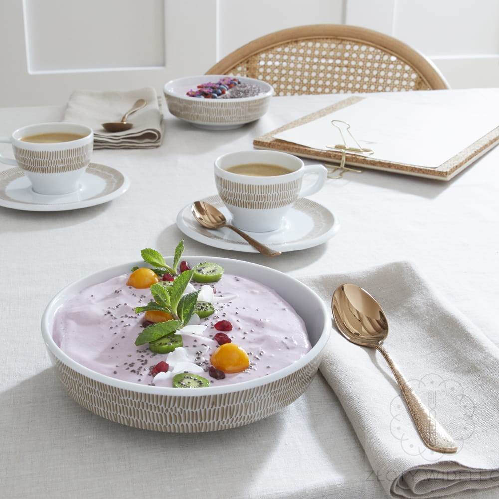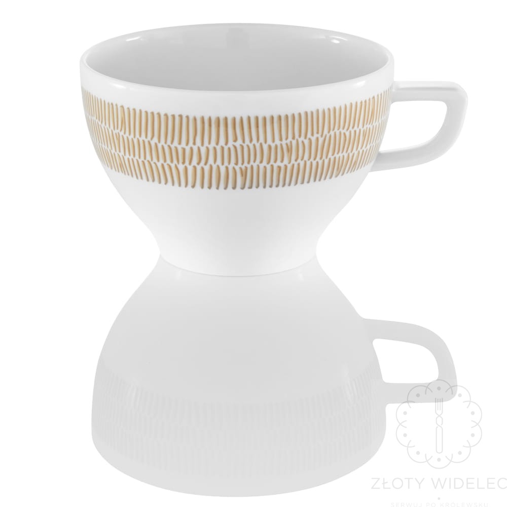 Dekoracja naniesiona jest na porcelanę WMF z kolekcji Synergy (można ją dowolnie łączyć z produktami z tej linii). Będzie pasować do nowoczesnych i klasycznych przestrzeni. Wyróżnia się estetyką wykonania, funkcjonalnością i mnogością zastosowań oraz najwyższą wytrzymałością. Sprawdzi się zarówno na wytworne przyjęcia jak i na co dzień. Kolekcja oferuje duży wybór filiżanek. Konstrukcja uchwytów jest ergonomiczna, zapewnia pewny uchwyt bez możliwości oparzenia się. Naczynia są bardzo wytrzymałe na ścieranie, zarysowania i wyszczerbienia, nie tracą koloru. Porcelana wypalana jest w temperaturze powyżej 1400 ° C. co daje najwyższą z możliwych twardości szkliwa, dlatego sprawdzi się podczas użytkowania domowego, ale również w hotelach i restauracjach. Wszystkie produkty Synergy można sztaplować, dzięki temu są łatwe do przechowywania oraz zapewniają oszczędność miejsca w kuchni. Naczynia można używać w mikrofali oraz myć w zmywarce. Dzięki koncepcji mix & match SYNERGY i STYLE LIGHTS naczynia są kompatybilne z wieloma innymi elementami kolekcji.