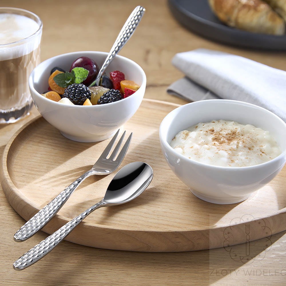 Kolekcja Tessa zachwyca geometrycznym, młotkowanym wzorem uchwytów, który pięknie odbija światło i nadaje sztućcom nowoczesnego, wyrazistego charakteru. To detal, który sprawia, że nawet najmniejsze elementy zastawy prezentują się wyjątkowo elegancko.