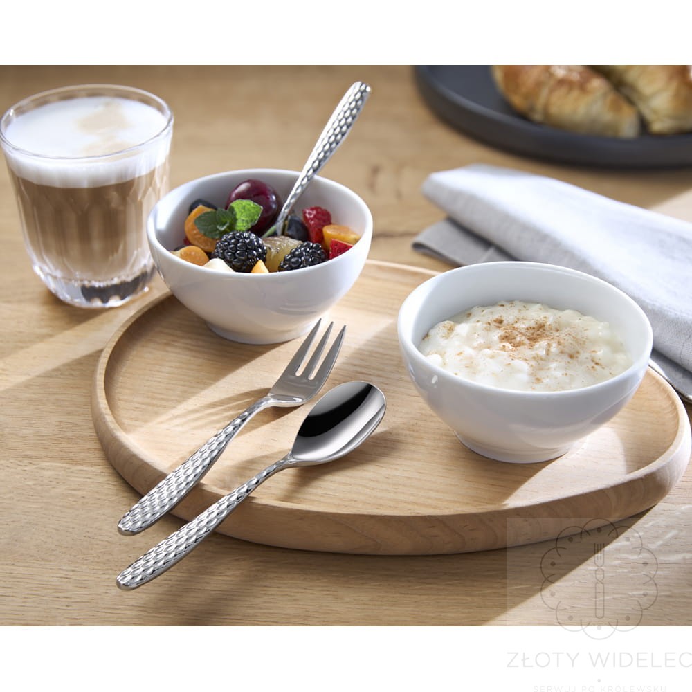 WMF Tessa – designerski zestaw sztućców dla 12 osób (60 elementów) to propozycja dla tych, którzy szukają nowoczesnego designu w najwyższej jakości wykonania. Charakterystyczna strukturą uchwytów przyciąga uwagę – elegancko tłoczona powierzchnia o wyraźnej, trójwymiarowej fakturze tworzy efekt "optical touch", który jest zarówno przyjemny wizualnie, jak i praktyczny w codziennym użytkowaniu. To sztućce, które z pewnością przyciągną uwagę i nadadzą stołowi niepowtarzalnego stylu.