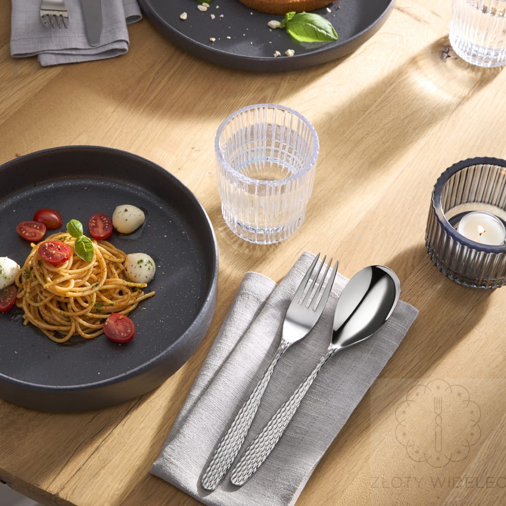 Kolekcja Tessa to część nowej linii THE NEW EASY, łączącej minimalistyczne formy z wyrazistą stylistyką. Zestaw wykonano z opatentowanej stali nierdzewnej Cromargan® 18/10 – materiału, który charakteryzuje się odpornością na korozję, neutralnością w smaku i trwałością na lata. Sztućce można bezpiecznie myć w zmywarce bez ryzyka utraty połysku.