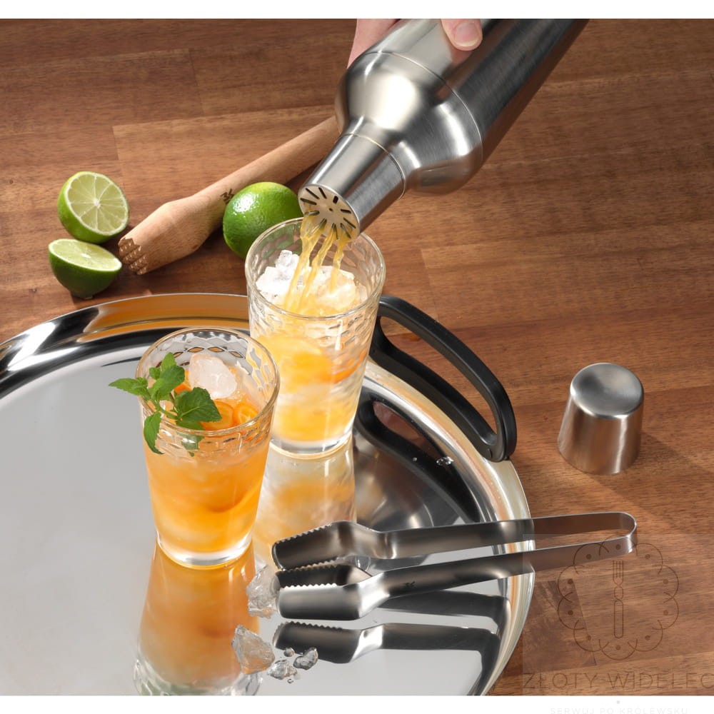 • Zestaw 3 w 1: shaker z sitkiem i miarką, tłuczek drewniany, szczypce do lodu