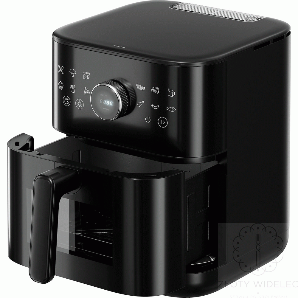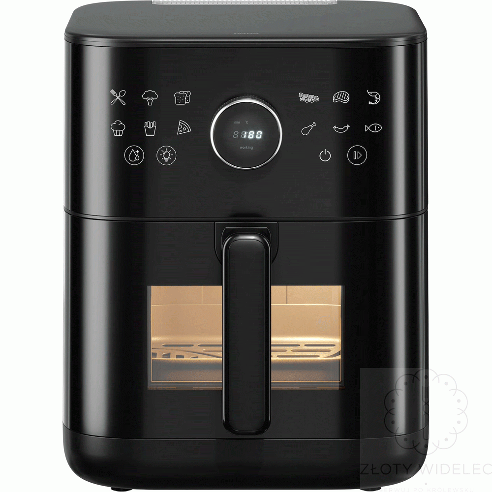 Funkcja spryskiwania wodą dodatkowo podbija efekt chrupiącej skórki, zapewniając jeszcze lepsze rezultaty. Duży kosz o pojemności 6 litrów pozwala przygotować porcje dla całej rodziny, a 12 automatycznych programów ułatwia codzienne gotowanie – od frytek, przez mięsa, aż po warzywa i wypieki.